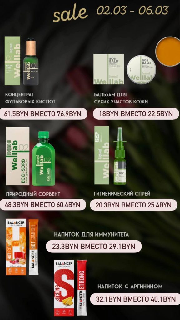 Позаботьтесь о своем здоровье и зарядитесь хорошим самочувствием для новых свершений вместе с товарами брендов Welllab, Balancer и TeaVitall, на которые со 2 марта (10:00 по времени столицы) по 6 марта (23:59 по времени столицы) действует скидка до 20 %.